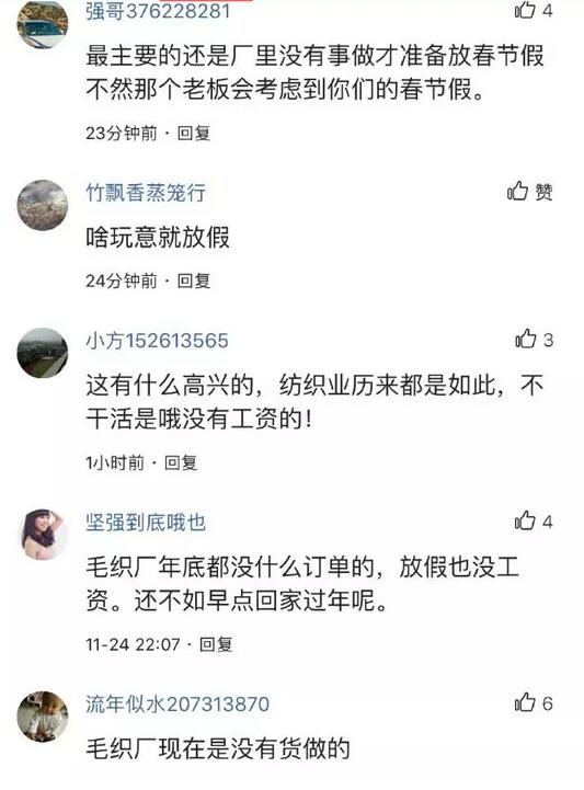 網友:服裝放假早,我們雙十一后就開始賣庫存清貨,不讓廠里做貨了,賣完放假,年后就開始做新款春款了! 網友:計件工廠慣用伎倆,回來人去樓空。做了十幾年的老工人將損失幾萬。因為如果裁員的話會補工資,好像是做滿一年補一月! 網友:現在毛織行業冷談,好多廠都沒貨做,我在中山這邊也放假了,一年就六七個月是旺季,真的不想再干毛織這行了! 網友:我們廠12月20日前,除了守廠人員,全部放假。到目前為止,8月份工資都未收到,押了好幾個月工資了,明年可能要4月份才開工。明年打算找別的廠了! 網友:說不定等到年后回來上班,大家連工廠都找不到了,因為老板趁大家休假的時候把廠都已經搬空了,卷款逃跑了,這也不是不可能的事,大家還是多留個心眼兒吧,最好是休假期間能夠安排人盯著工廠和老板的動向吧!