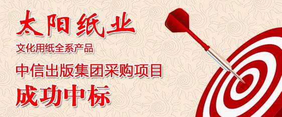 2018年11月13日,太陽紙業文化用紙銷售部再傳捷報,中信出版集團股份有限公司公布了“2018-2019年度圖書印裝材料采購項目”中標公告,太陽紙業旗下:金太陽美術純質紙、金太陽書紙(玉白)、金太陽膠版紙、華夏太陽膠版紙、華夏太陽輕型紙1.8米白、華夏太陽銅版紙成功中標。