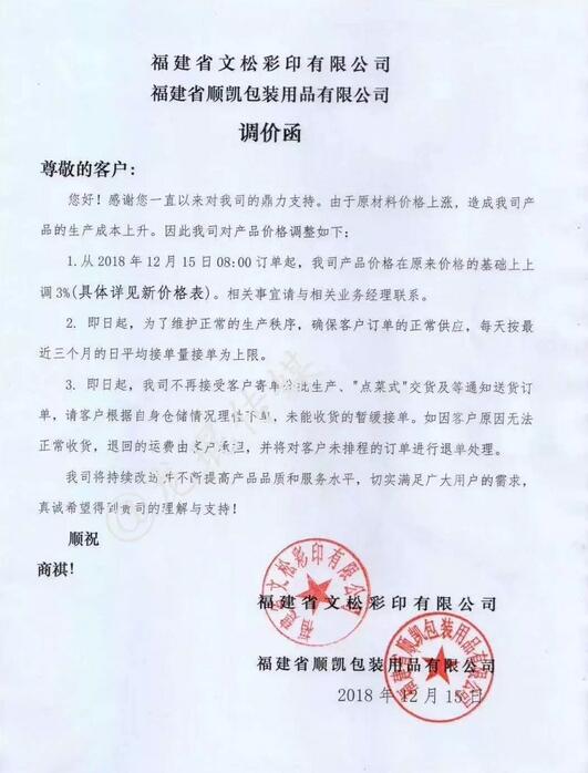 福建省文松彩印有限公司/福建省順凱包裝用品有限公司 自2018年12月15日8:00起,在原價格的基礎(chǔ)上上調(diào)3%。
