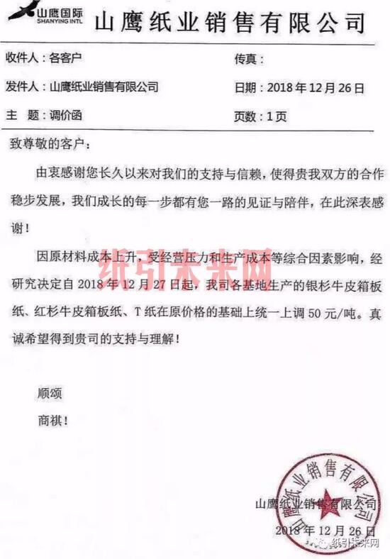 在國廢漲勢下,山鷹紙業宣布從今天起各基地生產的箱板紙上調50元/噸。但另外一邊,廣東地區幾家紙企卻逆勢下調廢紙價格,其中廣東玖龍下調幅度最大,為100元/噸,同時公布了1月份的停機計劃。 一、山鷹紙業從今天開始原紙漲50元/噸,東莞玖龍公布最新的停機計劃 山鷹紙業銷售有限公司:因原材料成本上升,受經營壓力和生產成本等綜合因素影響,決定自2018年12月27日起,我司各基地生產的銀杉牛皮箱板紙、紅杉牛皮箱板紙、T紙在原價格的基礎上統一上調50元/噸。