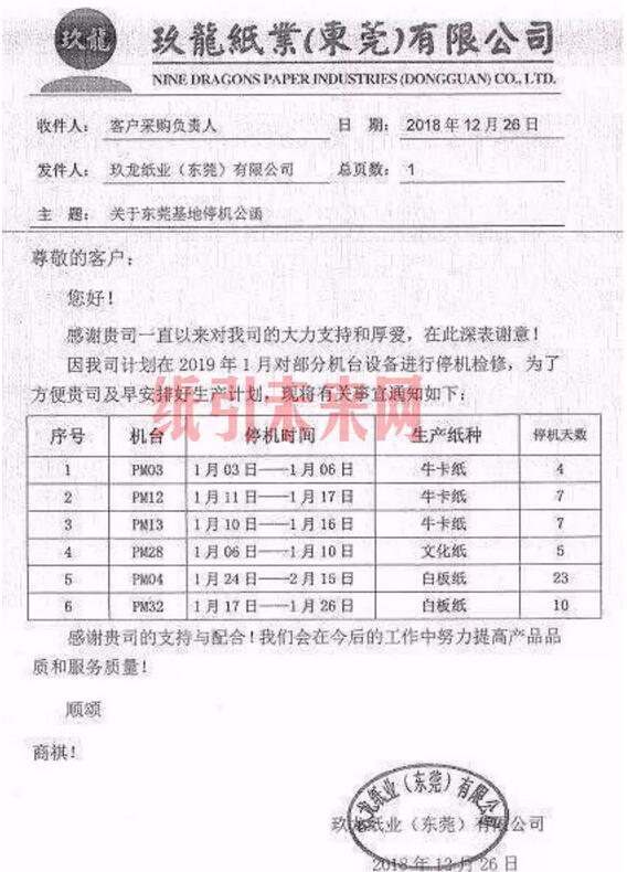 東莞玖龍紙業有限公司:因我司計劃在2019年1月對部分機臺設備進行停機檢修,為了方便貴司及早安排好生產計劃,現將有關事宜通知如下:1、PM03機臺停機時間為1月3日——1月6日,停機天數為4天,主要生產牛卡紙;2、PM12停機時間為1月11日-17日,停機7天,生產牛卡紙;3、PM13停機時間為1月10日——1月16日,停機7天,主要生產牛卡紙;4、PM28停機時間為1月6日——1月10日,停機5天,主要生產文化紙;5、PM04停機時間1月24日——2月15日,停機23天,主要生產白板紙;6、PM32停機時間為1月17日——1月26日,停機10天,主要生產白板紙。