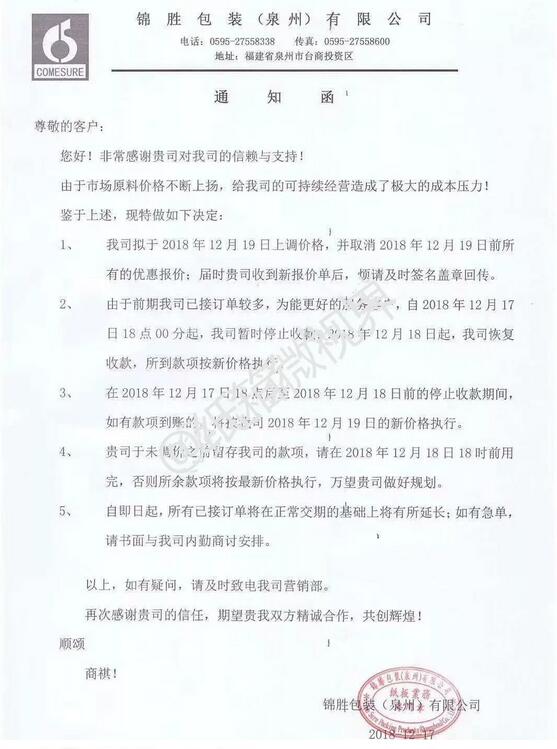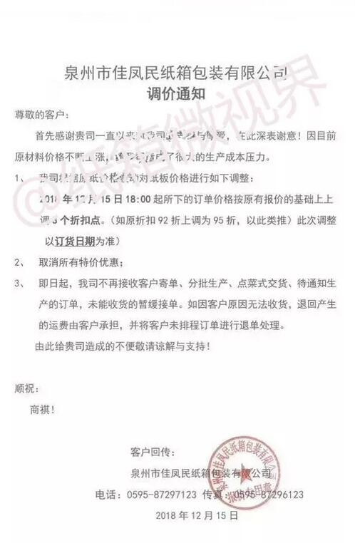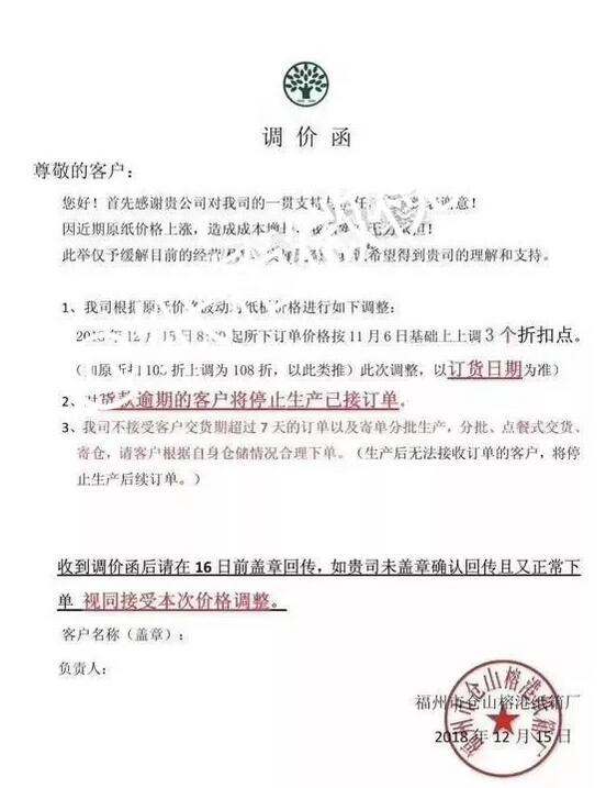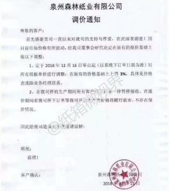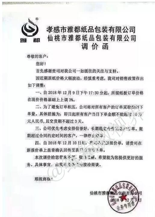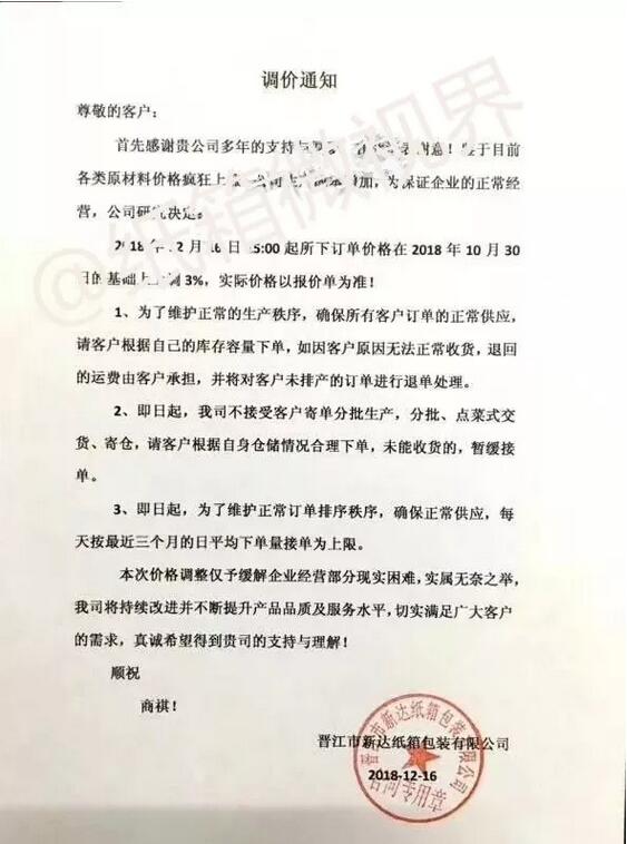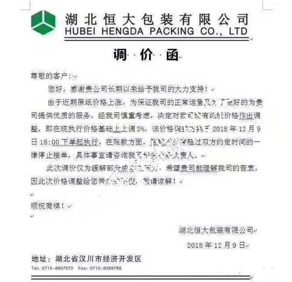 12月份因原紙暴漲,又有3家紙板廠發布漲價函,目前,紙板漲價函已增至21張,多漲3%,部分上漲100元/噸,另有部分漲1.7元/平方!77張原紙、紙板漲價函滿天飛,國廢上漲情緒下原紙、紙板漲價還將繼續,紙箱廠頂不住了!! 杭州三星紙業有限公司:12月21日起,灰板紙出廠價統一上漲100元/噸(未交付的訂單也在漲價范圍內)。到期貨款未付清一律停止發貨。 溫州鴻馬包裝有限公司:12月20日上午11:00起,所有預付款和月結客戶價格在11月5日標準價基礎上上漲。細瓦二層瓦楞紙板上調0.05元/平方,細瓦三層紙板上調0.05元/平方。 宿州龍發包裝有限公司:12月19日17:30接單起(以單到款到為準)所有紙板價格在原折扣上上調3個點。 據小編不完全統計,除以上新增的3家紙板廠的漲價函外,不到10天,已有18家紙板廠發布漲價通知。 換句話說,目前,紙板漲價函已增至21張。紙板多漲3%,部分上漲100元/噸,另有部分漲1.7元/平方!