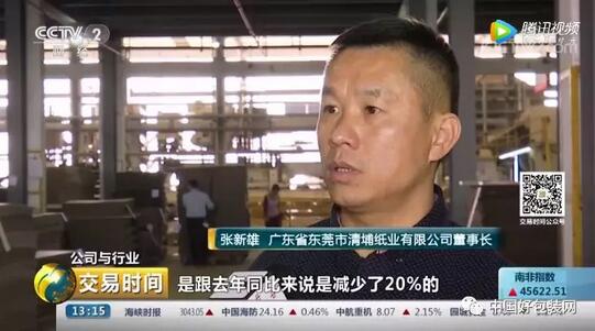 廣東省東莞市清埔紙業有限公司董事長張新雄:整體訂單在下半年同比減少了20%。整個上游降價,是因為整體下游的訂單逐步減少,也造成了上游的產能過剩,逐步在降價。訂單減少確實是會影響到我們這邊,我們也感受到員工的開工率沒那么高了。