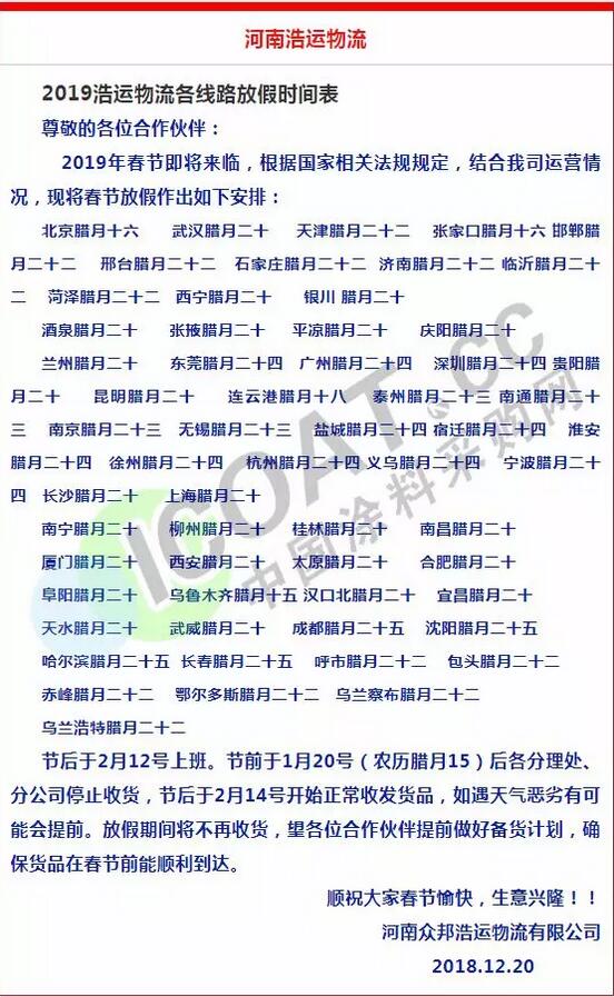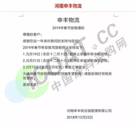 導語:年關將近,很多物流公司都陸續發布了2019年春節停運通知。大部分物流公司從1月20日起開始放假,部分甚至在1月10日、12日就停止收貨。有包裝廠也發出通知,春節將至,工廠放假,物流、運輸休息!要下單的老板們,抓緊啦!