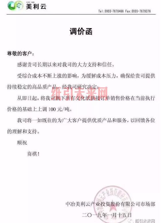 中治美利云產業(yè)投資股份有限公司:受綜合成本不斷上漲的影響,為緩解成本壓力,確保給貴司提供持續(xù)穩(wěn)定的高品質產品,經我司研究決定:從即日起,將我司旗下所有文化紙新接訂單銷售價格在當前執(zhí)行價格的基礎上上調100元/噸。