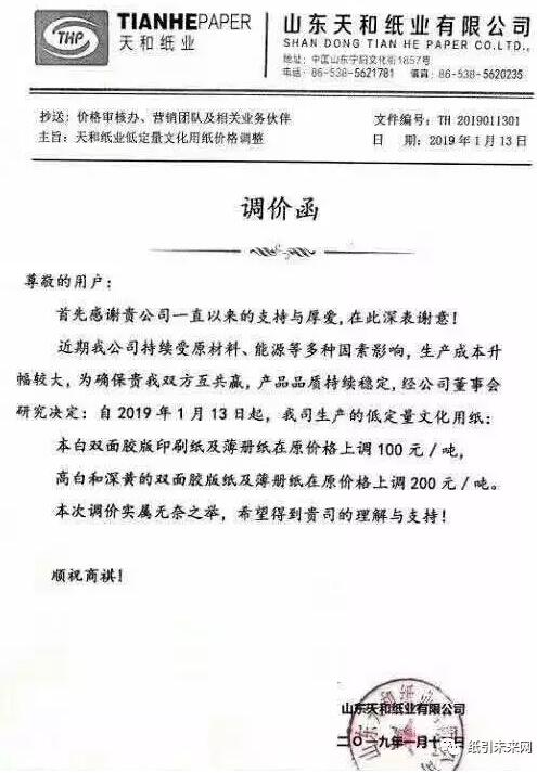 山東天和紙業(yè)有限公司:近期我公司持續(xù)受原材料、能源等多種因素影響,生產成本升幅較大,為確保貴我雙方互共贏,產品品質持續(xù)穩(wěn)定,經公司董事會研究決定:自2019年1月13目起,我司生產的低定量文化用紙:本白雙面膠版印刷紙及薄冊紙在原價格上調100元/噸,高白和深黃的雙面膠版及薄冊紙在原價格上調200元/噸。