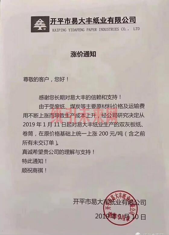 開平市易大豐紙業(yè)有限公司:由于受廢紙、煤炭等主要原材料價格及運輸費用不斷上漲而導致生產成本上升,經公司研究決定從2019年1月11日起對易大豐紙業(yè)生產的雙灰板紙、卷筒,在原價格基礎上統(tǒng)一上漲200元/噸(含之前所有未交訂單)。