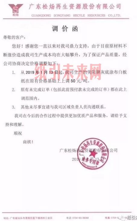 廣東松煬再生資源股份有限公司:由于目前原材料不斷漲價造成我司生產成本均在大幅攀升,為了保證產品質量,經公司協商決定價格調整如下:1.從2019年1月13日起,我司生產的美陽牌灰底涂布白板紙在原有價格基礎上上調50元/噸。2.所有未完成訂單(包括此前預付款未完成的訂單)都在此上調范圍內。