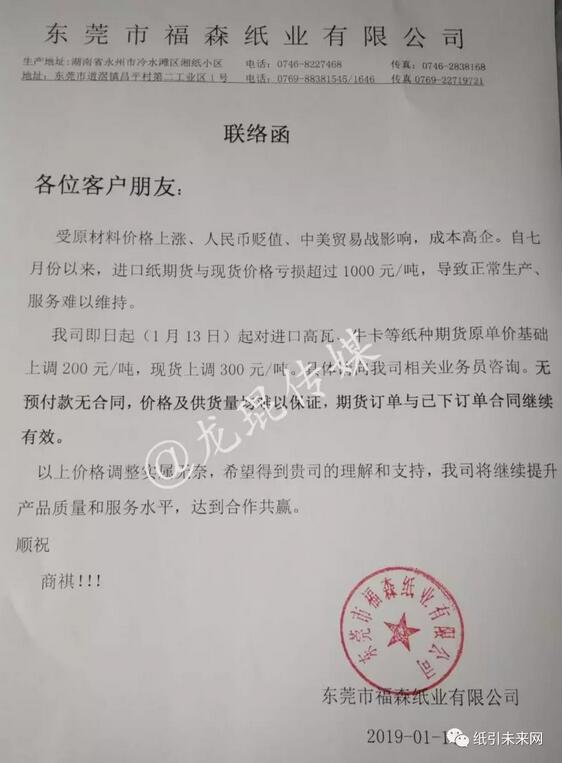 1月14日,東莞市福森紙業(yè)有限公司發(fā)布漲價函:自七月份以來,進口紙期貨與現貨價格虧損超過1000元/噸,導致正常生產、服務難以維持。1月13日起,對進口高瓦、牛卡等紙種期貨原單價基礎上調200元/噸,現貨上調300元/噸。