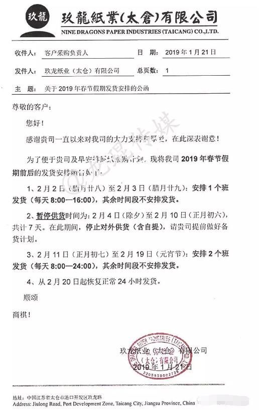 同時,玖龍紙業兩大基地--太倉玖龍和重慶玖龍發布了2019年春節期間的發貨計劃。 玖龍紙業(太倉)有限公司 2月2日(臘月二十八)至2月3日(臘月二十九):安排1個班發貨(每天8:00-16:00),其余時間不安排發貨; 暫停供貨時間為:2月4日(除夕)至2月10日(正月初六),共計7天; 2月11日(正月初七)至2月19日(元宵節):安排2個班發貨(每天8:00-24:00); 從2月29日起恢復正常24小時發貨。