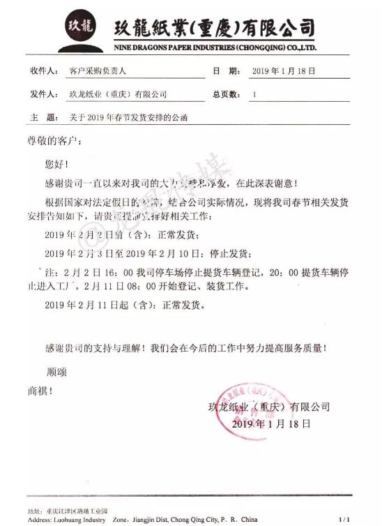 玖龍紙業(重慶)有限公司 2019年2月2日前(含):正常發貨; 2019年2月3日至2019年2月10日:停止發貨; 2月2日16:00停車場停止提貨車輛登記,20:00提貨車輛停止進入工廠;2月11日:8:00開始登記、裝貨工作; 2019年2月11日起(含):正常發貨。
