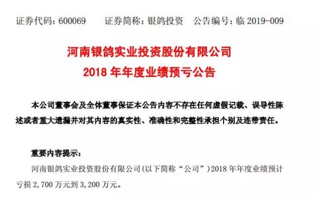 導語:河南銀鴿實業投資股份有限公司于1月30日發布2018年年度業績預虧公告,預計虧損2,700萬元到3,200萬元。