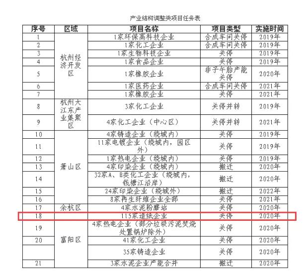 為貫徹落實(shí)黨的十九大提出的“堅(jiān)持全民共治、源頭防治,持續(xù)實(shí)施大氣污染防治行動(dòng),打贏藍(lán)天保衛(wèi)戰(zhàn)”的明確要求和市第十二次黨代會(huì)提出的建設(shè)全市域大氣“清潔排放區(qū)”的目標(biāo)要求,持續(xù)改善杭州市大氣環(huán)境質(zhì)量,根據(jù)《中華人民共和國(guó)大氣污染防治法》《浙江省大氣污染防治條例》《杭州市大氣污染防治規(guī)定》以及《杭州市人民政府辦公廳關(guān)于杭州市建設(shè)全市域大氣“清潔排放區(qū)”的實(shí)施意見(jiàn)》(杭政辦〔2017〕2號(hào))等有關(guān)規(guī)定要求,結(jié)合杭州市市城市總體規(guī)劃、國(guó)民經(jīng)濟(jì)社會(huì)發(fā)展規(guī)劃和能源發(fā)展規(guī)劃等實(shí)際情況,制定出該規(guī)劃,與造紙、印刷行業(yè)相關(guān)的內(nèi)容如下: 文件表明,為持續(xù)改善杭州市的大氣環(huán)境質(zhì)量, 首先需要優(yōu)化產(chǎn)業(yè)布局。深入實(shí)施“一號(hào)工程”,做強(qiáng)戰(zhàn)略性新興產(chǎn)業(yè),提升傳統(tǒng)優(yōu)勢(shì)產(chǎn)業(yè),充分發(fā)揮民營(yíng)經(jīng)濟(jì)優(yōu)勢(shì),加快民營(yíng)經(jīng)濟(jì)轉(zhuǎn)型發(fā)展。實(shí)現(xiàn)產(chǎn)業(yè)高端化、低碳化、集約化,深化“畝產(chǎn)論英雄”改革,到2020年,全市規(guī)模以上工業(yè)企業(yè)單位能耗增加值、單位排放增加值年均分別提高4%以上。進(jìn)一步做強(qiáng)杭州高新開(kāi)發(fā)區(qū)、杭州經(jīng)濟(jì)開(kāi)發(fā)區(qū)、蕭山經(jīng)濟(jì)技術(shù)開(kāi)發(fā)區(qū)、余杭經(jīng)濟(jì)技術(shù)開(kāi)發(fā)區(qū)內(nèi)的優(yōu)勢(shì)產(chǎn)業(yè)和特色產(chǎn)業(yè),積極發(fā)展創(chuàng)新型產(chǎn)業(yè)和高附加值現(xiàn)代服務(wù)業(yè),組團(tuán)發(fā)揮各自區(qū)位優(yōu)勢(shì)發(fā)展特色產(chǎn)業(yè)。 實(shí)施項(xiàng)目、總量、空間“三位一體”準(zhǔn)入制度,嚴(yán)格控制高污染高能耗行業(yè)新增產(chǎn)能,根據(jù)區(qū)域大氣環(huán)境質(zhì)量現(xiàn)狀,對(duì)各區(qū)、縣(市)實(shí)施特征污染物總量控制制度。全市生態(tài)保護(hù)紅線范圍內(nèi)禁止新建污染大氣環(huán)境的生產(chǎn)性項(xiàng)目,上城、下城、江干、拱墅、西湖、濱江等六區(qū)范圍內(nèi)原則上不再新建、擴(kuò)建產(chǎn)生VOCs排放的工業(yè)項(xiàng)目。力爭(zhēng)到2020年,工業(yè)涉氣信訪重復(fù)投訴量比2017年下降30%。到2021年,完成富陽(yáng)區(qū)造紙行業(yè)、杭州經(jīng)濟(jì)開(kāi)發(fā)區(qū)化工行業(yè)、杭州大江東產(chǎn)業(yè)集聚區(qū)化纖行業(yè)的關(guān)停搬遷,打造全市域和諧“廠群關(guān)系”。 其次,需要淘汰落后產(chǎn)能,嚴(yán)格落實(shí)國(guó)家16部委《關(guān)于利用綜合標(biāo)準(zhǔn)依法依規(guī)推動(dòng)落后產(chǎn)能退出的指導(dǎo)意見(jiàn)》。明確區(qū)域產(chǎn)業(yè)發(fā)展負(fù)面清單,加大杭州大江東產(chǎn)業(yè)集聚區(qū)化工企業(yè),富陽(yáng)區(qū)造紙、化工、冶煉,蕭山區(qū)印染、化工企業(yè),建德市化工企業(yè)的淘汰、關(guān)停、轉(zhuǎn)型力度。到2020年,先行淘汰小冶煉、塑料造粒(含廢品回收)、小化工等行業(yè)企業(yè),對(duì)未進(jìn)入工業(yè)園區(qū)(產(chǎn)業(yè)聚集區(qū))的化工、造紙、冶煉、鑄造、電鍍等重污染行業(yè)企業(yè)實(shí)施“騰籠換鳥(niǎo)”。到2025年,分步實(shí)施并完成造紙、印染、化工、建材、電鍍、冶煉等重點(diǎn)高耗能重污染行業(yè)企業(yè)兼并重組和整合入工業(yè)園區(qū)(產(chǎn)業(yè)集聚區(qū))工作。 到2020年,全市VOCs排放總量比2015年下降26%以上。其中化工、化纖、工業(yè)涂裝、紡織印染、橡塑制品行業(yè)減少30%以上,包裝印刷行業(yè)減少50%以上。 此外,還要推廣清潔生產(chǎn)工藝,包裝印刷行業(yè)推廣低(無(wú))VOCs排放的生產(chǎn)工藝、設(shè)備,優(yōu)化烘干技術(shù)。在紙制品包裝、塑料軟包裝等領(lǐng)域,推廣使用柔印等低(無(wú))VOCs排放的印刷工藝。 該文件最后列舉了杭州市各個(gè)區(qū)域產(chǎn)業(yè)結(jié)構(gòu)調(diào)整類(lèi)項(xiàng)目任務(wù)表,以及區(qū)域特色產(chǎn)業(yè)VOCs污染治理任務(wù)表,值得關(guān)注的是,其中有115家造紙企業(yè)將會(huì)于2020年關(guān)停,具體情況如下表所示: (1)產(chǎn)業(yè)結(jié)構(gòu)調(diào)整類(lèi)項(xiàng)目任務(wù)表