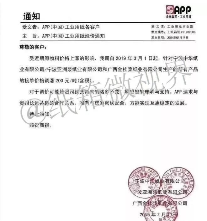 2月17日,APP發布漲價函: 2019年3月1日起,寧波中華紙業有限公司/寧波亞洲漿紙業有限公司和廣西金桂漿紙業有限公司生產的所有產品接單價格調漲200元/噸(含稅)