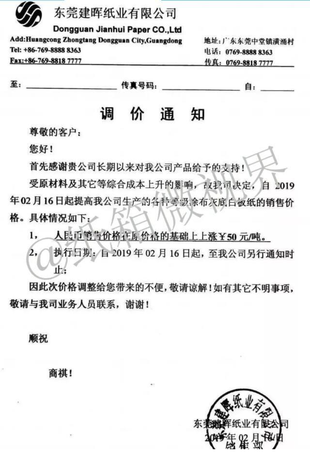 2月16日,東莞建暉紙業有限公司發布漲價函: 2019年2月16日起提高公司生產的各種等級涂布灰底白板紙銷售價格,在原價格的基礎上上漲50元/噸。