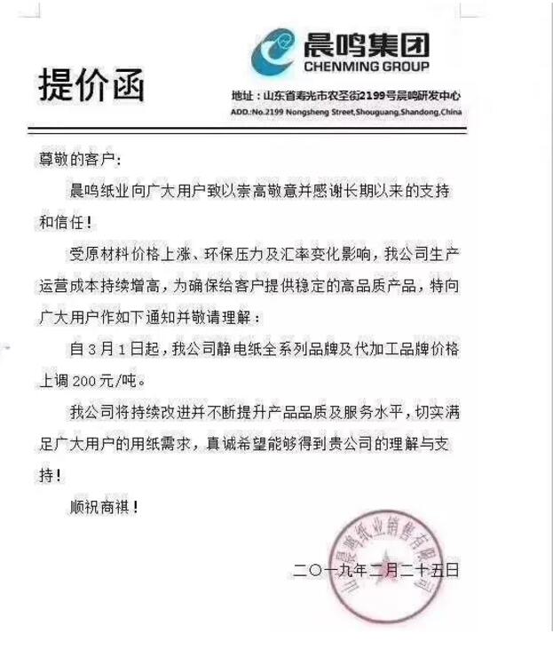 晨鳴集團:自3月1日起,我公司文化之類產(chǎn)品價格全部上調(diào)200元/噸。靜電紙全系列品牌及代加工品牌價格上調(diào)200元/噸。