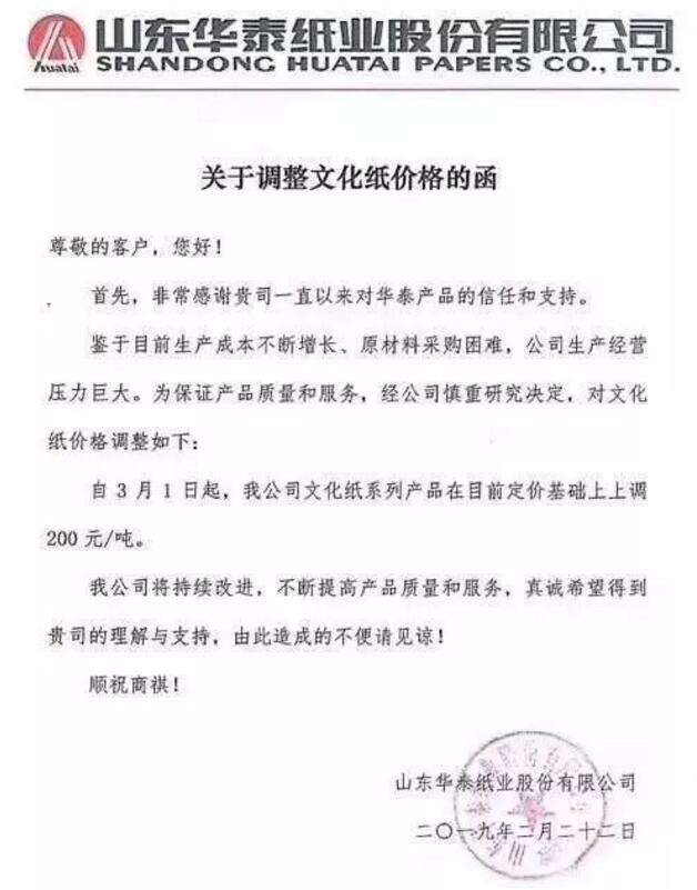 山東華泰紙業(yè):自3月1日起,我公司文化紙系列產(chǎn)品在目前定價基礎(chǔ)上上調(diào)200元/噸。