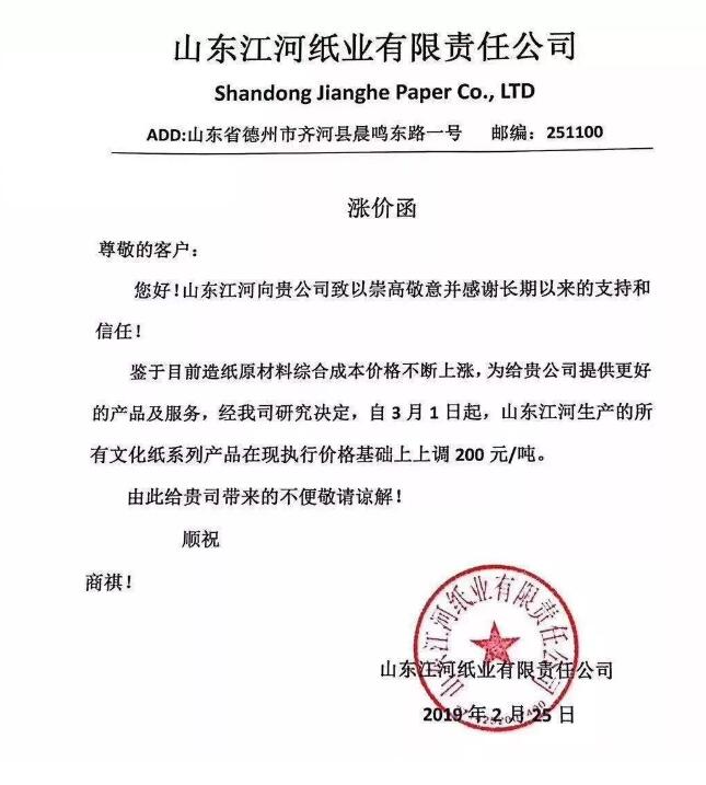 山東光華紙業(yè):經(jīng)我公司慎重研究決定自2019年2月26日起,我公司所有雙膠紙價格上調(diào)200元/噸。