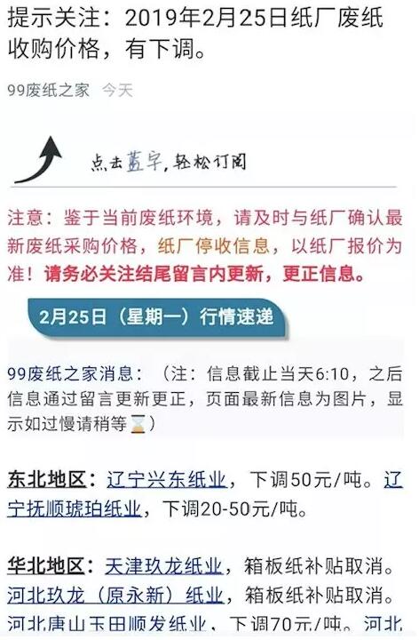 導語:2月24開始,國廢普遍下調(diào)20-200元/噸,這波原紙漲價潮結束,紙廠成最大贏家。而原定3月1日開始的加征關稅延期,國內(nèi)出口用包裝需求增加。紙漿行情繼續(xù)看漲,下游聚集正常紙箱訂單后再拉漲廢紙行情,新一輪漲價即將開始。 國廢下調(diào)20-200元/噸,這波原紙漲價潮結束,紙廠成最大贏家