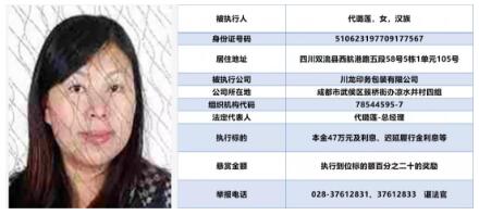 被執(zhí)行人:代璐蓮,女,漢族,生于1977年9月17日,住四川雙流縣西航港路五段58號(hào)5棟1單元105號(hào)。公民身份號(hào)碼:510623197709177567。
