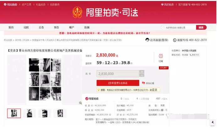 近日,阿里司法拍賣平臺上發布了一家彩印廠的拍賣信息:安徽省休寧縣人民法院將拍賣黃山市四方彩印包裝有限公司的房地產及機械設備。