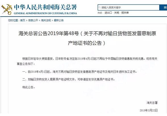 有日本出口業(yè)務的企業(yè)注意了,趕緊出貨!4月1日起,日本對中國進口關稅將會提高,出口企業(yè)的錢將更不好賺了。 近日,海關總署公告:4月1日起,海關不再對輸日貨物簽發(fā)普惠制原產(chǎn)地證書及相關日本進料加工證書。 具體內(nèi)容如下: