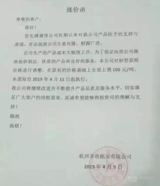 杭州豐收紙業:公司生產的產品成本大幅度上升,為了保證向貴公司繼續提供穩定、優質的產品和良好的服務,本公司對紗管原紙價格進行調整,在原有的價格基礎上全部上調100元/噸。