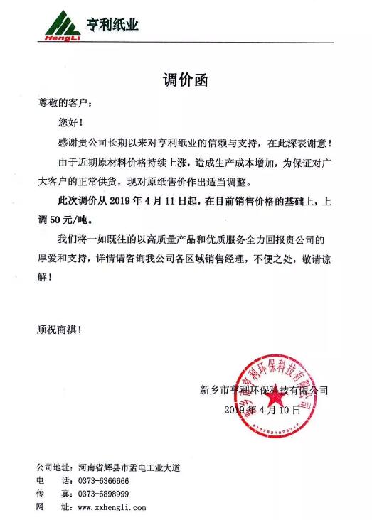撫寧縣前韓宏嘉紙業:我公司因原料價格上漲,導致成本增加。為了能更好的服務貴公司,我司高瓦將從4月9日上調100元。