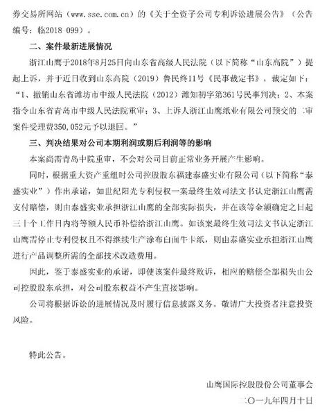 涉案專利摘要 2、鑒定機構作出的《鑒定意見書》存在重大瑕疵; 3、原告世紀陽光主張一億元賠償金額沒有事實依據(jù); 4、浙江山鷹和世紀陽光均是購買的維美德公司產品,維美德公司明確指出兩家公司的造紙設備在壓榨部和涂布部技術方面存在區(qū)別,兩種技術在生產產品的工藝實現(xiàn)上并不相同; 5、浙江山鷹生產的產品依托的是簾式涂布機,而世紀陽光依托的是刮刀涂布機,兩者生產的是不同的產品。 2018年8月,山東省濰坊市中級人民法院的一審民事判決書((2012)濰知初字第361號)判決如下: 1、浙江山鷹、順發(fā)經貿立即停止侵害涉案發(fā)明專利權的行為; 2、浙江山鷹于本判決生效之日起十日內,賠償原告李文君(原告“世紀陽光”)經濟損失及合理開支共計6,165.0435萬元; 3、順發(fā)經貿在浙江山鷹賠償原告經濟損失及合理開支5萬元范圍內承擔連帶責任; 4、駁回世紀陽光的其他訴訟請求; 2018年8月25日浙江山鷹向山東省高級人民法院提起上訴。 2019年4月10日浙江山鷹發(fā)布訴訟公告:近日收到山東高院(2019)魯民終11號《民事裁定書》,裁定如下: 1、撤銷山東省濰坊市中級人民法院(2012)濰知初字第361號民事判決; 2、本案指令山東省青島市中級人民法院重審; 3、上訴人浙江山鷹紙業(yè)有限公司預交的二審 附訴訟公告: