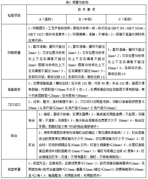 瀘州市酒類包裝用瓦楞紙箱執(zhí)行新標(biāo)準(zhǔn) 瀘州市酒類包裝研究協(xié)會(huì)發(fā)布了《瀘州市酒類包裝研究協(xié)會(huì)團(tuán)體標(biāo)準(zhǔn)之包裝 酒用瓦楞紙箱》,本標(biāo)準(zhǔn)是通過對(duì)白酒行業(yè)內(nèi)瓦楞紙箱的廣泛調(diào)查和相關(guān)企業(yè)意見的基礎(chǔ)上提出的,為規(guī)范協(xié)會(huì)內(nèi)部瓦楞紙箱生產(chǎn)企業(yè)產(chǎn)品質(zhì)量,特制定本標(biāo)準(zhǔn)。該標(biāo)準(zhǔn)于首次發(fā)布時(shí)間為2019年03月15日,實(shí)施時(shí)間為2019年04月01日。 1、范圍 本標(biāo)準(zhǔn)規(guī)定了酒用瓦楞紙箱的術(shù)語和定義、分類、要求、檢驗(yàn)與試驗(yàn)、檢驗(yàn)規(guī)則、標(biāo)志、包裝、運(yùn)輸和貯存。 本標(biāo)準(zhǔn)適用于以單瓦楞和雙瓦楞紙板加工制成的,用于包裝酒類飲料的瓦楞紙箱。 2、規(guī)范性引用文件 下列文件對(duì)于本文件的應(yīng)用是必不可少的。凡是注明日期的引用文件,僅所注日期的版本適用于本文件,凡是不注明日期的引用文件,其最新版本(包括所有的修改單)適用于本文件。 GB/T 191 包裝儲(chǔ)運(yùn)圖示標(biāo)志 GB/T 2679.7 紙板戳穿強(qiáng)度的測定 GB/T 2828.1 計(jì)數(shù)抽樣檢驗(yàn)程序第1部分:按接收質(zhì)量限(AQL)檢索的逐批檢驗(yàn)抽樣計(jì)劃 GB/T 4857.4 包裝運(yùn)輸包裝件基本試驗(yàn)第4部分:采用壓力試驗(yàn)機(jī)進(jìn)行的抗壓和堆碼試驗(yàn)方法 GB/T 4892 硬質(zhì)直方體運(yùn)輸包裝尺寸系列 GB/T 6543 運(yùn)輸包裝用單瓦楞紙箱和雙瓦楞紙箱 GB/T 6544 瓦楞紙板 GB/T 6545 瓦楞紙板耐破強(qiáng)度的測定法 GB/T 6546 瓦楞紙板邊壓強(qiáng)度的測定法 GB/T 10346 白酒檢驗(yàn)規(guī)則和標(biāo)志、包裝、運(yùn)輸、貯存 GB/T 10739 紙漿紙和紙板試樣處理和試驗(yàn)的標(biāo)準(zhǔn)大氣 GB/T 13023 瓦楞芯(原)紙 GB/T 13024 箱紙板 GB/T 14257 商品條碼條碼符號(hào)放置指南 3、定義或術(shù)語 下列術(shù)語和定義適用于本標(biāo)準(zhǔn)。 3.1 酒用瓦楞紙箱 corrugatedbox for wine 以單瓦楞和雙瓦楞紙板為箱體材料,用于包裝酒類飲料的包裝箱。 4、要求 4.1 瓦楞紙箱的設(shè)計(jì)、生產(chǎn)應(yīng)遵循安全、方便、快捷、經(jīng)濟(jì)和環(huán)保的原則。 4.2 瓦楞紙箱采用的原紙、油墨、粘合劑、扁絲等原輔材料應(yīng)符合國家相關(guān)標(biāo)準(zhǔn)的規(guī)定。 4.3 材料 瓦楞紙板所用材料的定量及質(zhì)量水平應(yīng)根據(jù)瓦楞紙板邊壓強(qiáng)度和耐破強(qiáng)度的要求選擇符合GB/T 13023和GB/T 13024中相關(guān)質(zhì)量水平等級(jí)的材料。 制造瓦楞紙箱所使用的瓦楞紙板見GB/T 6543中第3章規(guī)定。 4.4 質(zhì)量與結(jié)構(gòu) 根據(jù)客戶對(duì)紙箱的使用材料及具體指標(biāo)要求的不同,可將紙箱分為A、B、C三個(gè)等級(jí),分別對(duì)應(yīng)為高檔紙箱、中檔紙箱和低檔紙箱。 瓦楞紙箱的質(zhì)量與結(jié)構(gòu)應(yīng)符合表1的規(guī)定。