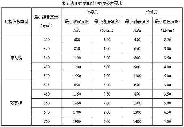 4.5 尺寸與偏差 紙箱的規(guī)格通常用內(nèi)尺寸、展開尺寸(或制造尺寸)或外尺寸表示,單位mm。關(guān)于這三種尺寸及三種尺寸的關(guān)系,按GB/T 6543的規(guī)定。 瓦楞紙箱的尺寸偏差為單瓦楞紙箱±2mm,雙瓦楞紙箱±4mm。 瓦楞紙箱所使用的瓦楞紙板厚度應(yīng)符合GB/T 6544中4.4.2的規(guī)定。 4.6 交貨水分 紙箱的交貨水分應(yīng)不大于12%。 4.7 物理機(jī)械性能 瓦楞紙箱的邊壓強(qiáng)度、耐破強(qiáng)度應(yīng)符合表2的規(guī)定。