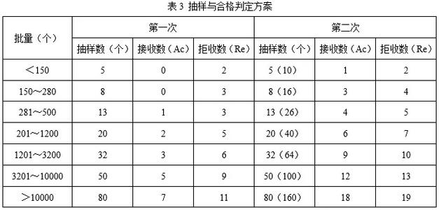 瓦楞紙箱任一粘合層的粘合強(qiáng)度應(yīng)不低于400N/m。 空箱抗壓強(qiáng)度:瓦楞紙箱的空箱抗壓強(qiáng)度按5.7規(guī)定的方法進(jìn)行平面壓力試驗(yàn),其強(qiáng)度值應(yīng)大于規(guī)定值。具體參數(shù)的確定參見GB/T 6543附錄D或由供需雙方協(xié)商確定。 戳穿強(qiáng)度:瓦楞紙箱的戳穿強(qiáng)度由供需雙方協(xié)商確定。 堆碼性能:瓦楞紙箱的堆碼性能試驗(yàn)按5.9規(guī)定的方法進(jìn)行。要求經(jīng)過堆碼試驗(yàn)后,箱面形變<6mm,內(nèi)包裝物無損壞。 5、檢驗(yàn)方法 5.1 質(zhì)量與結(jié)構(gòu) 紙箱的套印偏差、文字和圖案偏差、搖蓋耐折、刀口切口、粘合或釘合、成型的質(zhì)量采用目測或用尺子測量的方法進(jìn)行檢驗(yàn)。 條碼檢驗(yàn):采用專用條碼檢測儀器檢驗(yàn),要求儀器識(shí)別數(shù)字與紙箱條形碼及產(chǎn)品標(biāo)準(zhǔn)條形碼三者一致。 附著力檢測:用手在圖案和色塊上反復(fù)擦拭,紙箱不掉色,手上不粘有明顯的油墨痕跡。 5.2 尺寸偏差 瓦楞紙箱的尺寸按GB/T 6543的規(guī)定進(jìn)行,瓦楞紙板的厚度按GB/T 6547的規(guī)定進(jìn)行。 5.3 交貨水分 按GB/T 462的規(guī)定進(jìn)行。 5.4 邊壓強(qiáng)度 按GB/T6546的規(guī)定進(jìn)行。 5.5 耐破強(qiáng)度 按GB/T6545的規(guī)定進(jìn)行。 5.6 粘合強(qiáng)度 按GB/T6548的規(guī)定進(jìn)行。 5.7 空箱抗壓強(qiáng)度 按GB/T 4857.4的規(guī)定進(jìn)行。試驗(yàn)時(shí)紙箱應(yīng)按擬采取的實(shí)際運(yùn)輸狀態(tài)進(jìn)行封合。 5.8 戳穿強(qiáng)度 按GB/T 2679.7的規(guī)定進(jìn)行。 5.9 堆碼性能 將紙箱置于水平地面上,堆碼高度按紙箱上標(biāo)識(shí)規(guī)定堆碼高度(層)+2(層)進(jìn)行。試驗(yàn)時(shí)紙箱應(yīng)按擬采取的實(shí)際運(yùn)輸狀態(tài)進(jìn)行封合。 6、檢驗(yàn)規(guī)則與抽樣 6.1 檢驗(yàn)分類 紙箱的檢驗(yàn)分為出廠檢驗(yàn)和型式檢驗(yàn)。 出廠檢驗(yàn):出廠檢驗(yàn)項(xiàng)目為除邊壓強(qiáng)度、耐破強(qiáng)度、粘合強(qiáng)度、空箱抗壓強(qiáng)度、戳穿強(qiáng)度和堆碼強(qiáng)度外的所有項(xiàng)目。 型式檢驗(yàn):型式檢驗(yàn)項(xiàng)目為第4章規(guī)定的全部項(xiàng)目(其中戳穿強(qiáng)度由供需雙方確定)。 6.2 組批與抽樣方案 以相同材料、相同工藝、相同規(guī)格、同時(shí)交付的產(chǎn)品為一批。 除邊壓強(qiáng)度、耐破強(qiáng)度、粘合強(qiáng)度、空箱抗壓強(qiáng)度、戳穿強(qiáng)度和堆碼強(qiáng)度每批次抽查5個(gè)紙箱外,其它項(xiàng)目按照GB/T 2828.1正常檢驗(yàn)二次抽樣方案進(jìn)行,一般檢測水平I,AQL=6.5,見表3。
