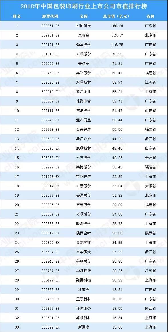 截止到2018年12月28日,2018年中國包裝印刷行業上市公司總市值排名前十的企業有:裕同科技、奧瑞金、勁嘉股份、東風股份、美盈森、昇興股份、雙星新材、紫江企業、珠海中富、東港股份。