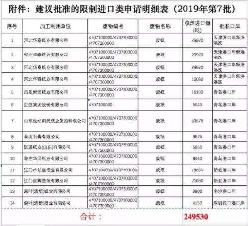 2019年5月10日,中國固化廢管理網發布2019年度第七批次外廢進口申請明細表。本批次共10家紙企獲批,核定進口總量為24.953萬噸。