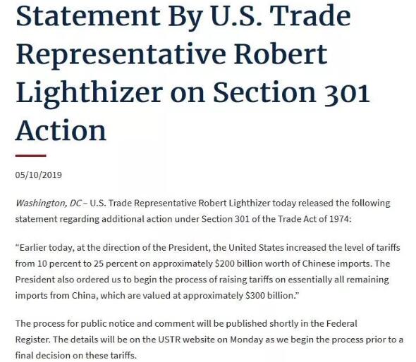 據最新消息,美國貿易代表辦公室(USTR)在其官網發布了一則聲明表示,特朗普總統下令將提高對剩下的所有中國產品的關稅,其涉及金額約為3000億美元。