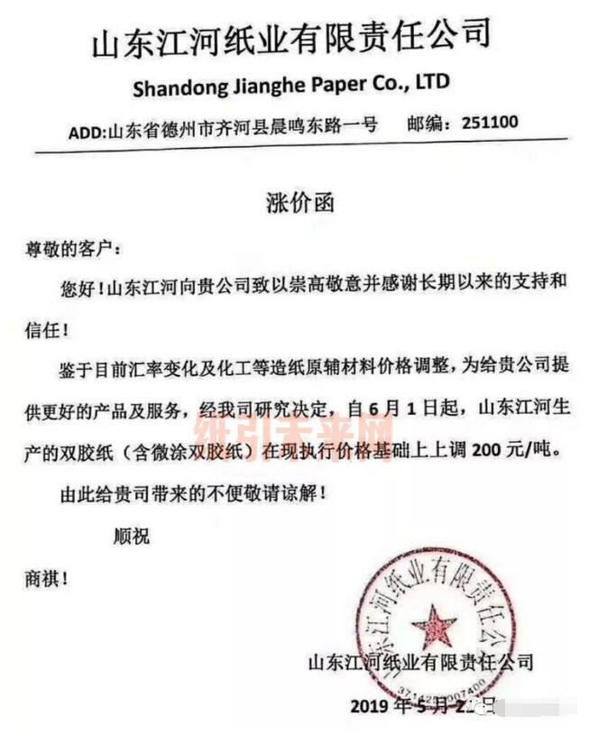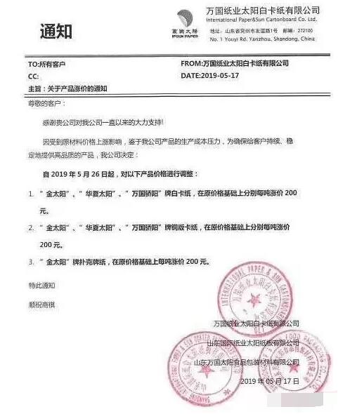 萬(wàn)國(guó)紙業(yè)太陽(yáng)白卡紙有限公司:近期因受到原材料就愛(ài)個(gè)上漲與鑒于后續(xù)人民幣匯率變化影響,自2019年6月1日起,針對(duì)萬(wàn)國(guó)紙業(yè)太陽(yáng)白卡紙有限公司生產(chǎn)以下食品類(lèi)產(chǎn)品就愛(ài)個(gè)進(jìn)行調(diào)整:“華夏太陽(yáng)”牌淋膜系列原紙,在5月份價(jià)格基礎(chǔ)上上調(diào)200元/噸。