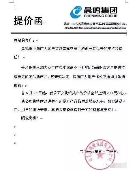 山東晨鳴紙業(yè)銷(xiāo)售有限公司:受環(huán)保投入加大及生產(chǎn)成本居高不下影響,自5月25日起,我公司文化紙類(lèi)產(chǎn)品價(jià)格上調(diào)200元/噸。