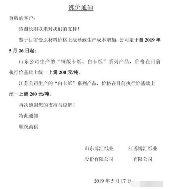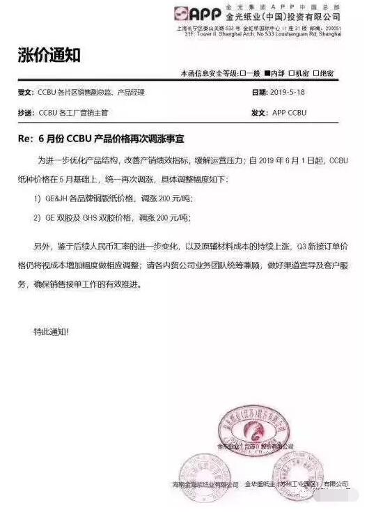 金光集團(tuán)(APP):受近期原材料價(jià)格上漲的影響,我司自2019年6月1日起,針對(duì)寧波中華紙業(yè)有限公司/寧波亞洲漿紙業(yè)有限公司和廣西金桂漿紙業(yè)有限公司生產(chǎn)的所有產(chǎn)品的接單價(jià)格調(diào)漲200元/噸(含稅)。