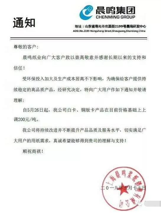 上海晨鳴漿紙銷(xiāo)售有限公司:受環(huán)保投入加大及生產(chǎn)成本居高不下影響,自5月26日起,我公司白卡、銅版卡產(chǎn)品在目前價(jià)格基礎(chǔ)上上調(diào)200元/噸。