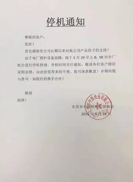 東莞中聯紙業:由于電廠鍋爐設備故障,現于5月29日早上8:00對全廠機臺進行停機檢修,開機時間另行通知。