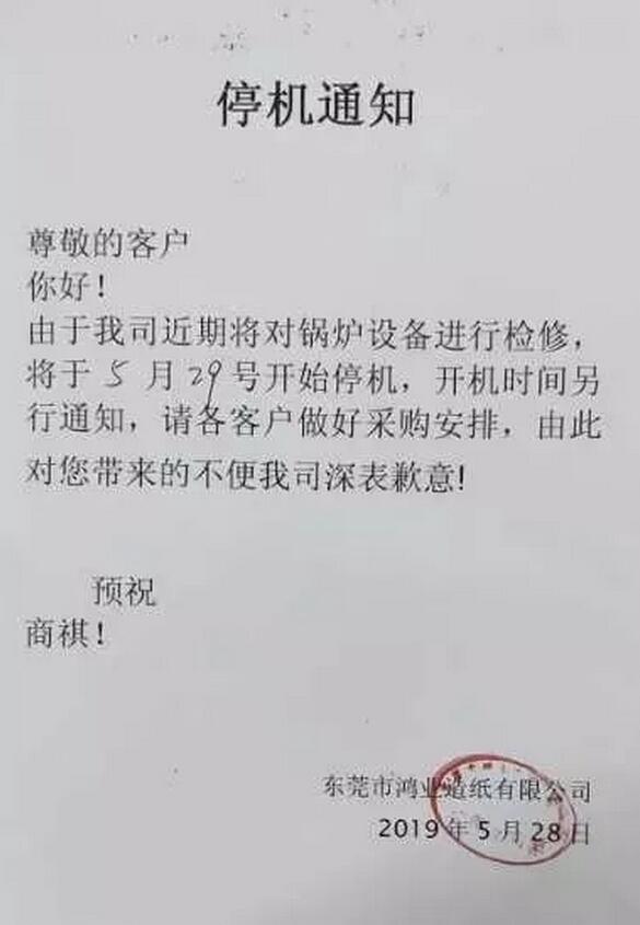 東莞鴻業紙業:由于近期將對鍋爐設備進行檢修,將于5月29日開始停機,開機時間另行通知。