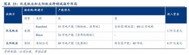 2、橫向擴張:漿紙布局雙管齊下,傳統邊界正在慢慢消失 海外擴張節奏:歐美收購成熟紙企改造,東南亞新建漿紙廠擴產。18年我國龍頭紙企加速出海、外延動作頻繁,具體可分為(1)收購派:玖龍紙業、山鷹紙業均通過收購美國、歐洲等地漿紙廠以便于獲得高質量的外廢原料;(2)建廠派:理文造紙、太陽紙業,則選擇在老撾、越南、馬來西亞等東南亞人工成本較低的地區布局延續勞動力成本紅利。針對國內造紙行業海外原材料依賴較嚴重、低端產品需求逐漸飽和的困境,龍頭企業率先選擇在海外進行產能布局或建設原料基地增厚行業競爭實力。