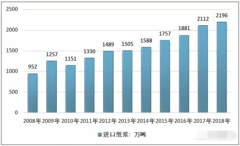 資料來源:智研咨詢整理 我國紙漿消費量位居全球第一,產量僅次于美國,居全球第二位,未來我國造紙產業還有巨大的發展空間。造紙工業發展是以森林資源可持續發展為基礎,而目前我國的森林資源遠不能滿足日益發展的制漿造紙工業的需要,為彌補原料供應的不足,每年要從國外進口相當數量的紙漿,我國已經成全球第一大進口國。 據統計2008年以來除2013年以及2018年國內需求下降以外,其余年度均保持增長態,2008年以來我國紙漿年均消耗增速超過2.5%;總體而言我國紙漿的消耗依然是以國產為主,進口紙漿為輔。其中國產紙漿消耗量近年來逐漸趨于穩定,然而每年通過進口而消耗的紙漿總量卻在逐年增加,2018年我國進口紙漿消耗總量創歷史新高,達到2196萬噸。 2008-2018年我國進口紙漿消耗量統計圖