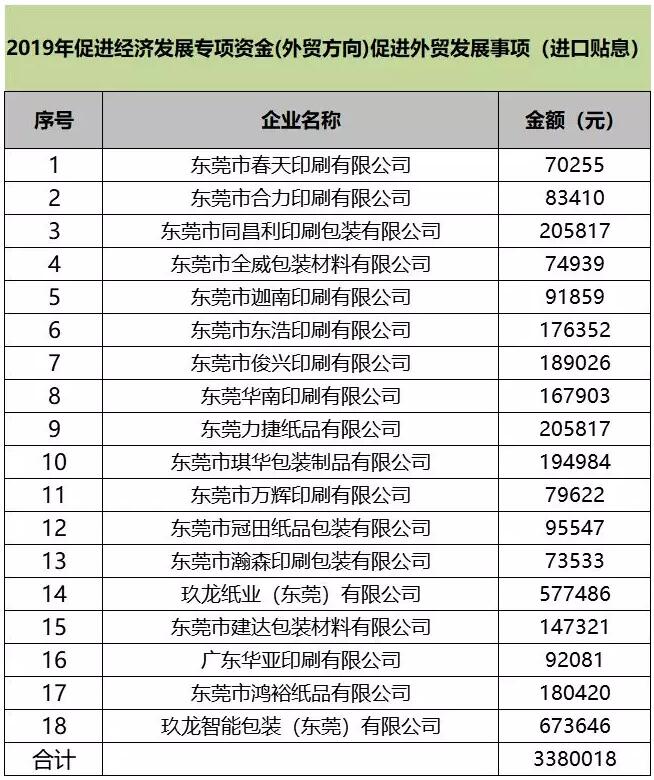導語:近日,東莞市商務局發布《關于撥付2019年促進經濟發展專項資金(外貿方向)促進外貿發展事項(進口貼息)的通知》,小編了解到,18家印刷包裝企業獲得補貼。 東莞18家印刷包裝企業獲商務局進口貼息,共計約338萬元 近日,東莞市商務局發布《關于撥付2019年促進經濟發展專項資金(外貿方向)促進外貿發展事項(進口貼息)的通知》,200多家企業將獲得進口貼息共計3000多萬元,其中,印刷包裝企業有18家,共計獲得進口貼息約338萬元。