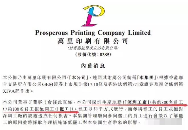 6月25日,港資上市印刷企業(yè)--萬里印刷發(fā)布公告稱,其深圳生產(chǎn)地的約800名員工中,有100名員工拒絕開工。罷工以和平方式進(jìn)行,參與罷工的員工并無對(duì)深圳工廠的設(shè)施造成任何損害。