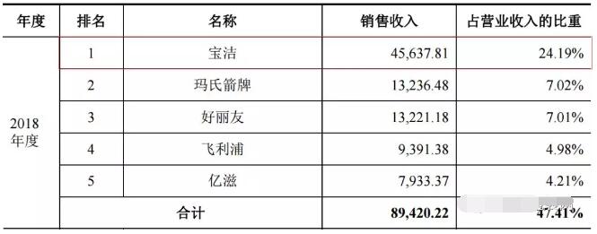 客戶多是國內外知名企業 在客戶方面,中榮印刷集團股份有限公司已與十余家全球500強企業及三十余家國內知名企業建立長期合作伙伴關系,包括寶潔、好麗友、瑪氏箭牌、飛利浦、雀巢、億滋、高露潔、百雀羚、維達紙業、立白等國內外知名企業。 以寶潔公司為例,這是中榮印刷集團股份有限公司2018年度最大的客戶,對其銷售收入達4.56億元,占營收的比重為24.19%。前五大客戶中另外四家是瑪氏箭牌、好麗友、飛利浦、億滋。前五家客戶的總銷售收入為8.94億元,占營收的比重為47.41%。