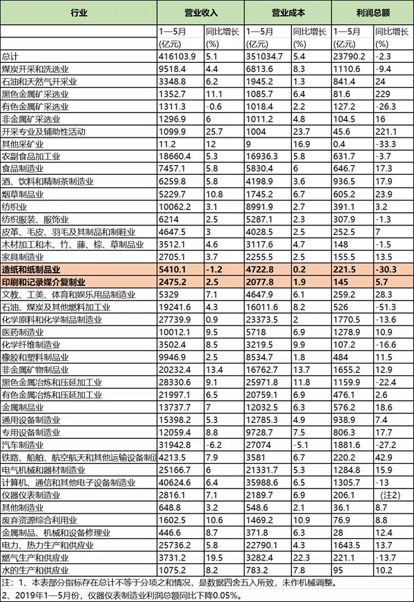 1-5月工業企業利潤累計同比仍維持負增,主要原因是去年同期基數較高和今年經濟總體偏弱。盡管5月當月同比增速相比于4月回升4.8個百分點,但原因更多在于3月透支需求導致4月相對較弱,因此5月工業企業利潤增速的回升僅僅是溫和修復,并非經濟觸底反彈的信號。三大產業中,1-5月采礦業同比大幅回升,由負轉正,電熱燃水增速擴大,制造業仍未有明顯改善,同比下滑4.1%,相比前值收窄0.6個百分點。 5月規模以上工業企業營業收入同比增長5.0%,相比前值回升5.7個百分點,主要原因是4月營收相對較弱而5月恢復正常。受益于減稅降費和5月人民幣貶值帶來的匯兌損益影響,工業企業費用增速有所回落,5月規模以上工業企業四項費用合計同比增長6.2%,較前值回落1.9個百分點。經測算,利潤增速的回升中有超過50%的部分是費用下降所貢獻。除此之外,煤炭等能源品價格上升也對5月工業利潤有所貢獻。 營運能力方面,1-5月工業企業同比營收增幅與成本增幅持平,營收利潤率降低0.43%。產成品存貨同比增長4.1%,較前值回落0.8%,應收賬款增速較前值回升2.7%,產成品存貨周轉天數環比下降。5月工業企業生產經營效益有所回暖,但趨勢上看被動補庫存仍未逆轉。 不容樂觀,造紙和紙制品行業1-5月營收兼凈利潤皆下滑 1-5月份,在41個工業大類行業中26個行業利潤總額同比增加,15個行業減少。其中,造紙和紙制品行業1-5月營業收入為5410.1億元,同比減少1.2%,利潤總額為221.5億元,同比減少30.3%。印刷和記錄媒介復制業1-5月營業收入為2475.2億元,同比增加2.5%,利潤總額為145億元,同比增加5.7%。
