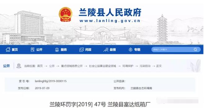 7月9日,山東省臨沂市蘭陵縣人民政府發(fā)布了一份行政處罰決定書,稱蘭陵縣富達紙箱廠因紙板生產(chǎn)線建設(shè)項目需要配套建設(shè)的環(huán)境保護設(shè)施未驗收便投入生產(chǎn),責令該企業(yè)立即停止生產(chǎn)或使用,并作出罰款人民幣貳拾萬元整的處罰。