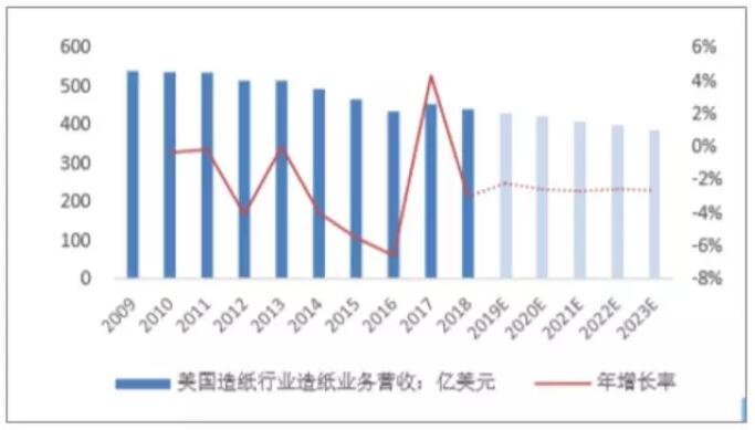 數據來源:公開資料整理 (2)文化用紙增長乏力,可替代性較強 美國學齡兒童數量經過上世紀末的快速增長,進入21世紀之后維持基本穩定,增長率幾乎為0。此外,根據美國人口普查局的預測數據,美國未來的人口粗出生率還將不斷下降。新生兒的減少,將會直接導致學齡兒童數量的減少,因此預期由教學引致的文化用紙需求將會有所下降。 對文化用紙需求產生影響的另一因素是電子傳媒產品。據統計,電子書在2013年之前經過井噴式增長之后,增長速度逐漸轉負,紙質書市場略有回暖。究其原因,是因為在2014年,美國主要的電子書銷售平臺與亞馬遜就電子書達成代理協議、電子書重新實行代銷制,售價抬高,嚇退消費者。盡管美國目前電子書銷售出現了下滑,陷入發展的瓶頸期,但是電子書相較于紙質書,具有便捷、環保的特點,同時互聯網的普及使盜版電子書的獲取、流通成本幾乎為零,因此預期在電子書的發展趨于規范之后,電子書有望進一步擴大其在圖書市場的份額。 (3)生活用紙需求穩定,可替代性極低 近幾年來,美國生活用紙銷售規模以1%~2%的速度穩步增長,與美國人均可支配收入基本保持同步增長,二者的增長趨勢比較一致。考慮到生活用紙的必選消費屬性,美國生活用紙被替代的可能性極低,但與此同時,結合美國經濟平穩增長的趨勢,生活用紙市場規模也不太可能出現大幅的擴張。 3、產業鏈:上游原材料供給充足,下游需求平穩增長 行業的議價能力可以從產業鏈的角度進行分析。造紙行業的上游行業是制漿、林木行業等,而下游則對接包裝、印刷等行業以及終端消費。造紙行業對上游的議價能力,可以從上游行業的企業數量、原材料的供給量以及造紙企業是否有向上游拓展業務來衡量。 具體來說,當上游呈現出下面的特點時,則造紙行業與上游的議價能力就越強: ①上游企業數量越多,造紙行業與上游的議價能力就越強; ②原材料供給越多,造紙行業與上游的議價能力就越強; ③造紙行業向上游拓展其業務,造紙行業與上游的議價能力就越強。 造紙行業對下游的議價能力可以從下游行業的企業數量、下游行業對造紙行業產品的需求量以及產品同質化程度等指標來衡量。 具體來說,當下游呈現出下面的特點時,則造紙行業與下游的議價能力就越強: ①下游企業數量越多,或需求越分散,造紙行業與下游的議價能力就越強; ②下游對紙制品的需求越旺盛,造紙行業與下游的議價能力就越強; ③造紙行業的產品同質化程度越低,造紙行業與下游的議價能力就越強。 美國造紙行業經過環保立法的去產能以及行業自身的兼并,目前僅有140余家造紙企業,CR10近年來維持在90%以上。造紙行業企業數量少,行業集中度很高,導致美國造紙行業在產業鏈上下游的議價能力相對較強。除此之外,美國造紙行業的原材料供給也十分充裕。 紙漿方面,2017年,全球紙漿總產量為18576.3萬噸,而其中美國的紙漿產量就達到了4835.1萬噸,占全球紙漿總產量的26.03%,紙漿出口量達到715.1萬噸,占全球紙漿總出口量的12.13%。美國在廢紙方面的優勢同樣明顯,2017年全球廢紙總出口量達到5699萬噸,而美國是全球最大的廢紙出口國,出口廢紙達到1828.9萬噸,占全球廢紙出口量的比重達到32.09%。 美國的廢紙回收率也非常高,近年來,美國廢紙回收率維持在70%上下,廢紙供給較為充足。可見,美國造紙行所需的原材料——紙漿及廢紙的供應都比較充裕。此外,美國造紙行業的龍頭公司如國際紙業等,大多擁有公司自有林地,或通過收購兼并等,拓展自己的上游制漿業務,逐步完善產業鏈布局,對上游的依賴程度較低,因此美國造紙行業與上游的議價能力也相對較強。 美國造紙行業下游議價能力方面,可以分紙種進行分析。 包裝用紙方面,美國的紙包裝行業已經發展的十分成熟,紙包裝市場規模已經能達到包裝市場總規模的50%以上,下游包裝行業對包裝用紙的需求較為旺盛。此外,美國造紙行業的龍頭企業,如國際紙業、WestRock、PackagingCropofAmerica等,都在自身的造紙業務之外,都有向下游拓展其包裝業務,而且紙包裝業務甚至已經成為個別公司的主要業務。行業向下游的業務拓展,在完善了自己的產業鏈之余,也解決了行業下游的產品議價問題。 生活用紙方面,從下游的需求方來看,生活用紙直接面向消費者,因此購買方相對分散,生活用紙制造商相對更有市場勢力,議價能力相對更強。目前美國人均生活用紙消費量已經達到20千克/年以上,在全球范圍內屬于領先水平。而且隨著美國經濟的進一步發展,人民生活水平的提升,生活用紙的需求會被進一步情境化,將會更多異質性的生活用紙需求產品涌現出來,以滿足消費者不同的細分生活用紙需求。結合生活用紙的剛性需求,下游消費者對生活用紙的需求會保持穩定增長,生活用紙生產商的下游議價能力相對強勢。 文化用紙則有所不同,隨著電子傳媒等新興閱讀方式的興起,紙質書的需求會逐步降低。作為一個需求導向型的行業,需求的低迷將會迫使造紙企業降低產品價格。換言之,造紙企業的議價能力較低。此外,和生活用紙、特種紙相比,文化用紙的產品異質性更弱,產品之間的同質性特點更為明顯。換言之,不同造紙企業的產品之間的替代性較強,行業議價能力也會因此而受到削弱。 綜合上述對美國造紙行業市場競爭格局及上下游的分析,美國造紙行業經過多年的發展,目前