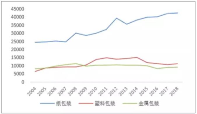 數據來源:公開資料整理 可以看出,美國的龍頭造紙企業在造紙業務之外,都會往上游制漿業務或下游包裝業務拓展延伸,甚至是和造紙業務關聯度不高的其他業務。不同公司側重的業務各不相同,從而在行業內形成了各家公司自己的護城河,在一個成熟行業的細分子行業中獲取更大的市場份額、尋求突破。而各公司除了自己側重的業務之外,多元化的業務布局也有利于提升公司抗風險能力。 2、結構特征:包裝用紙成為美國造紙行業主要增長動力 (1)包裝用紙需求受經濟增長、電商業務驅動 包裝用紙的需求主要受到國家整體經濟和電商、快遞服務影響。國民經濟向好的時候,貨物產出也會相應的擴大,對包裝紙的需求就會相應的上升。2008年經濟危機以來,美國經濟的增長速度基本維持在4%左右,經濟穩步增長,因此預期這將對包裝用紙產生穩定增長的需求。與包裝用紙關系密切的快遞、電商業務方面,美國也體現出了強勁的增長。快遞業的收入規模近年來保持5%以上的增長速度,并且該增長速度還有進一步加大的趨勢。 電子商務方面,除2008-2009年受經濟危機影響外,美國的電子商務銷售規模基本保持在10%的高速增長。受快遞業、電子商務快速發展的強勁拉動,美國的紙包裝業務收入在近十年來持續增長,而與此同時,包裝業務中的另外兩大類——塑料包裝和金屬包裝的業務收入基本保持不變,增長幅度較小。因此預期美國的包裝紙市場被金屬包裝、塑料包裝替代的可能性較低。 美國各品種包裝業收入(單位:百萬美元)